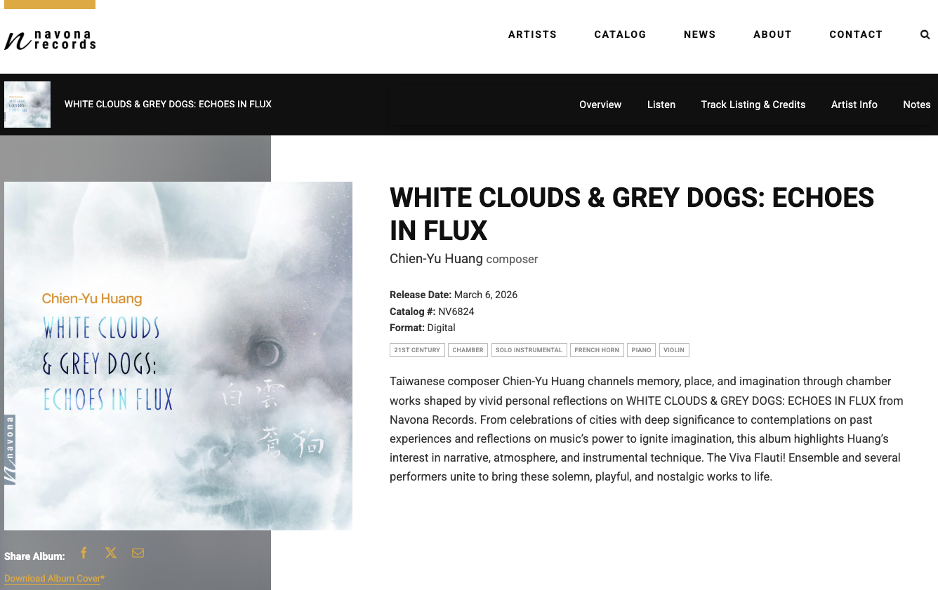 My first album of original compositions, White Clouds & Grey Dogs: Echoes in Flux, will be released on March 6 by Navona Records, the classical music imprint of the U.S. label PARMA Recordings.